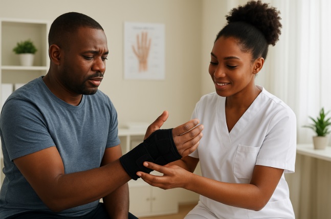 An African physiotherapist fits a black wrist brace on a male patient’s hand during treatment in a bright medical clinic, illustrating wrist pain care for Carpal Tunnel Syndrome. Credit: AI using OpenID’s DALL·E. Click on image to enlarge.