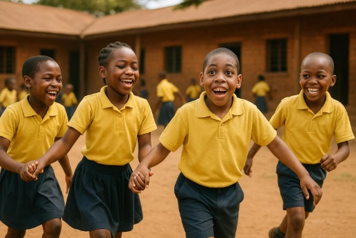 Children in an African school playing together with the autistic child. Click on image to enlarge. AI-generated image from: Sora AI