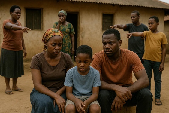 Image depiction of community-based stigma and isolation; a family looking sad while being pointed at because the child is autistic.