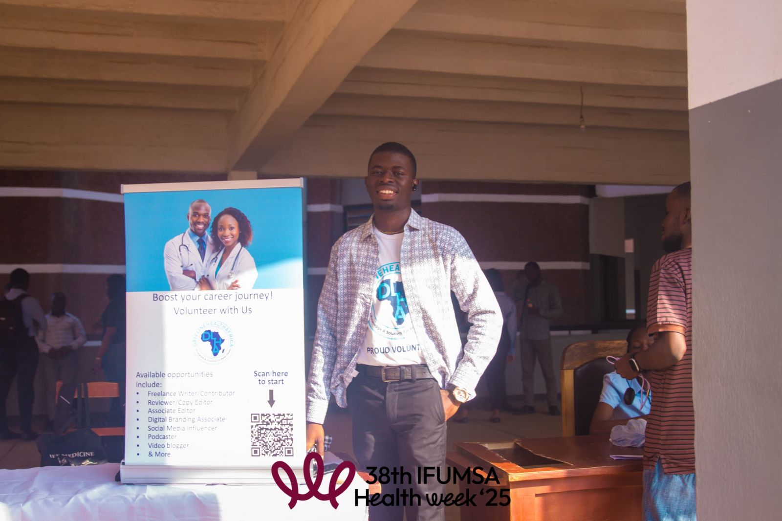Mr. Adebowale (Debo) Bello, Datelinehealth Africa representative at the 38th Annual IFUMSA Health week, 2025, standing beside the membership and volunteer recruitment table with a desk banner display.