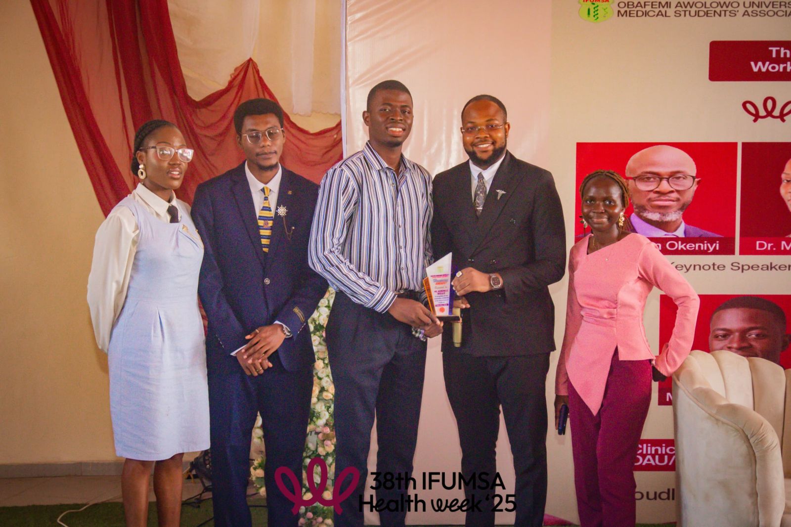Debo, Datelinehealth Africa representative standing in the centre, being presented with an award by Mr. Miracle Olajuyighe, the IFUMSA President. Others in the photo include from L – R: Ms. Adesewa Owoyemi, IFUMSA Conference Co-Lead, Mr. Victor Adewunmi, IFUMSA Conference Co-Lead, and Ms. Funmi Sopade, Health week Chairperson and IFUMSA Vice President.