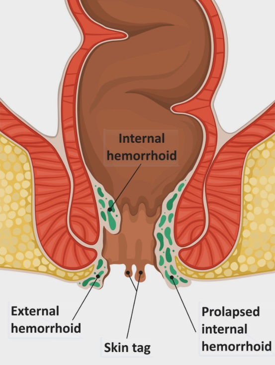 Fig. 2: Cartoon illustration of the anorectal region showing internal haemorrhoids inside the anal canal and external haemorrhoids around the anus. Gemini AI generated image.