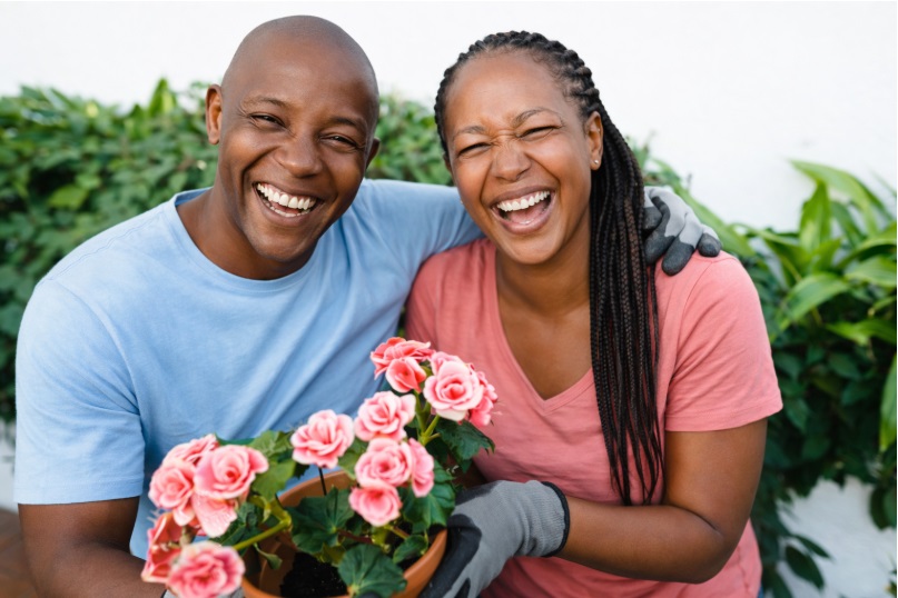 Image of a happy African couple in a garden, holding a pot of pink roses. Image created from ChatGPT. Click on image to enlarge.