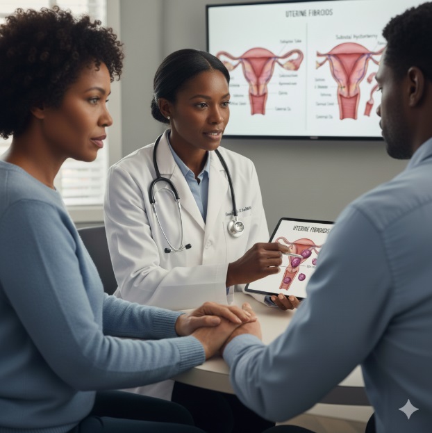 A Black female doctor in a white lab coat is counselling a Black couple wearing sky-blue tops about uterine fibroids and the possible need for a hysterectomy. Google AI generated image. Click on image to enlarge.