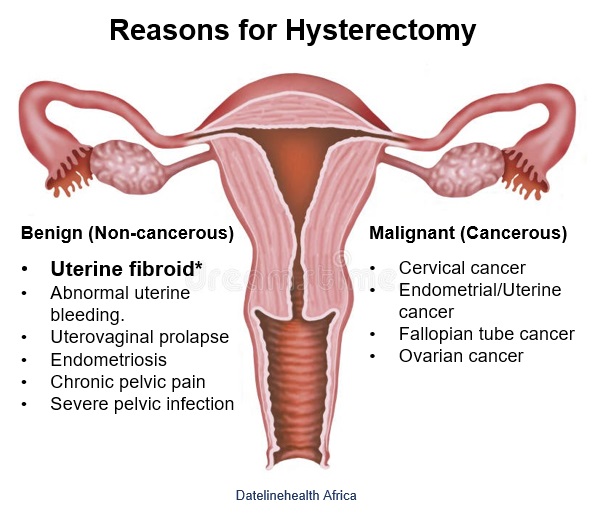 Illustration listing some reasons for hysterectomy. The commonest in Africa is uterine fibroid* Click on image to enlarge.