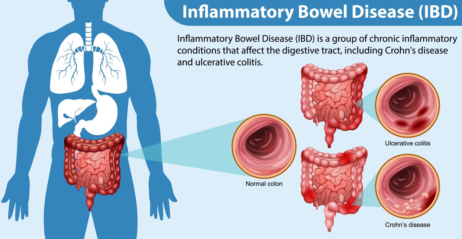 Inflammatory Bowel Disease (IBD) refers to a group of chronic disorders that cause inflammation in the digestive tract. It occurs when the body’s immune system mistakenly attacks the digestive tract, leading to long-term inflammation that damages the gut lining and disrupts normal digestion. Diseases like this, which are caused by the immune system's dysfunction, are called autoimmune disorders.