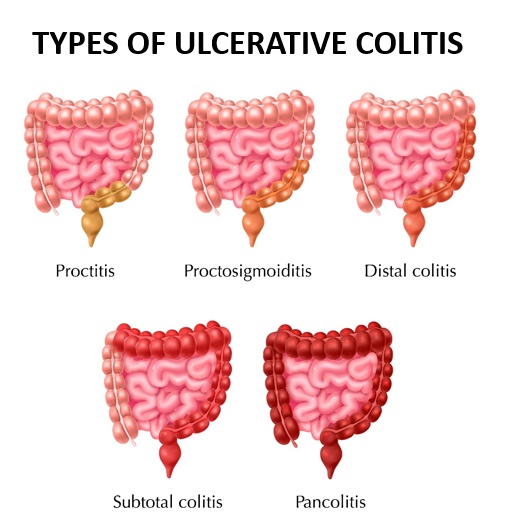This involves inflammation of the inner lining of the colon (the longest part of the large intestine). It typically occurs in a continuous stretch, without skipping areas. Depending on the affected area, ulcerative colitis can be sub-grouped into: (See fig. 1)