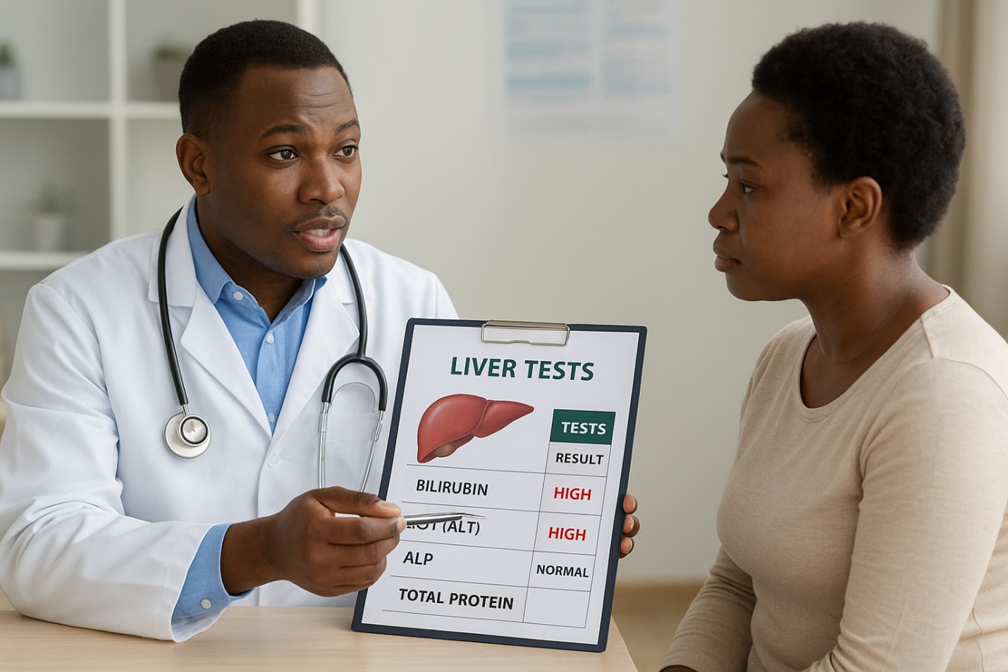 Photo of a doctor explaining liver test results to a patient in a clinic. AI image generated from ChatGPT. Click on image to enlarge.