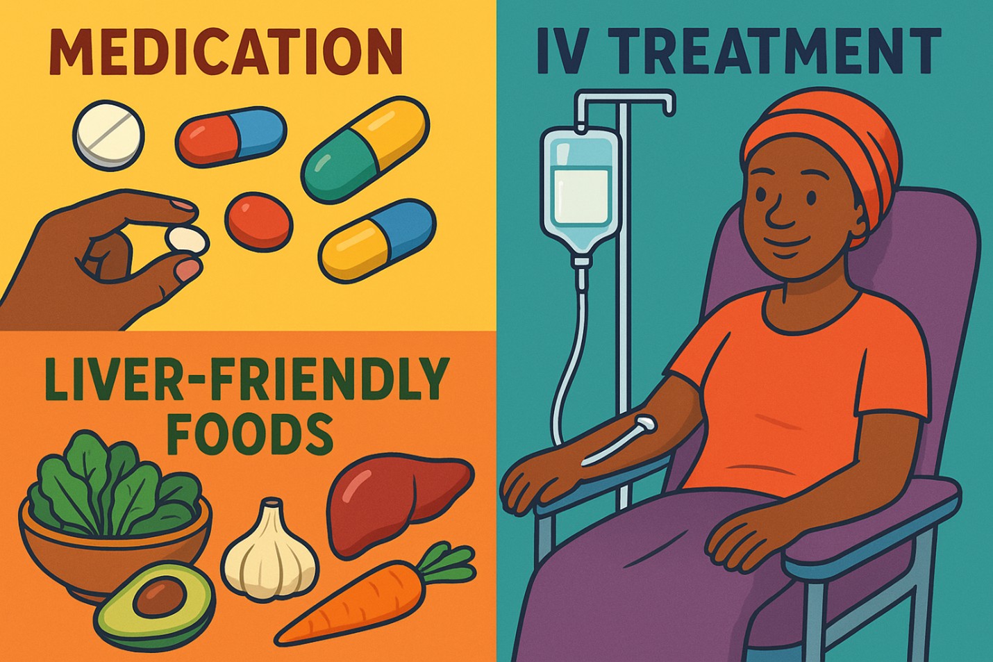 An info-poster showing treatment steps for jaundice. This commonly involves medications, including intravenous (IV) fluids, and liver-friendly foods. Click on image to enlarge.