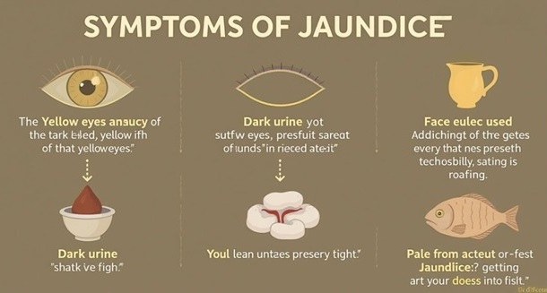 Infographic showing key symptoms of jaundice — yellow eyes, dark urine, pale stool, fatigue. An AI generated image from DeeVid. Click on image to enlarge.