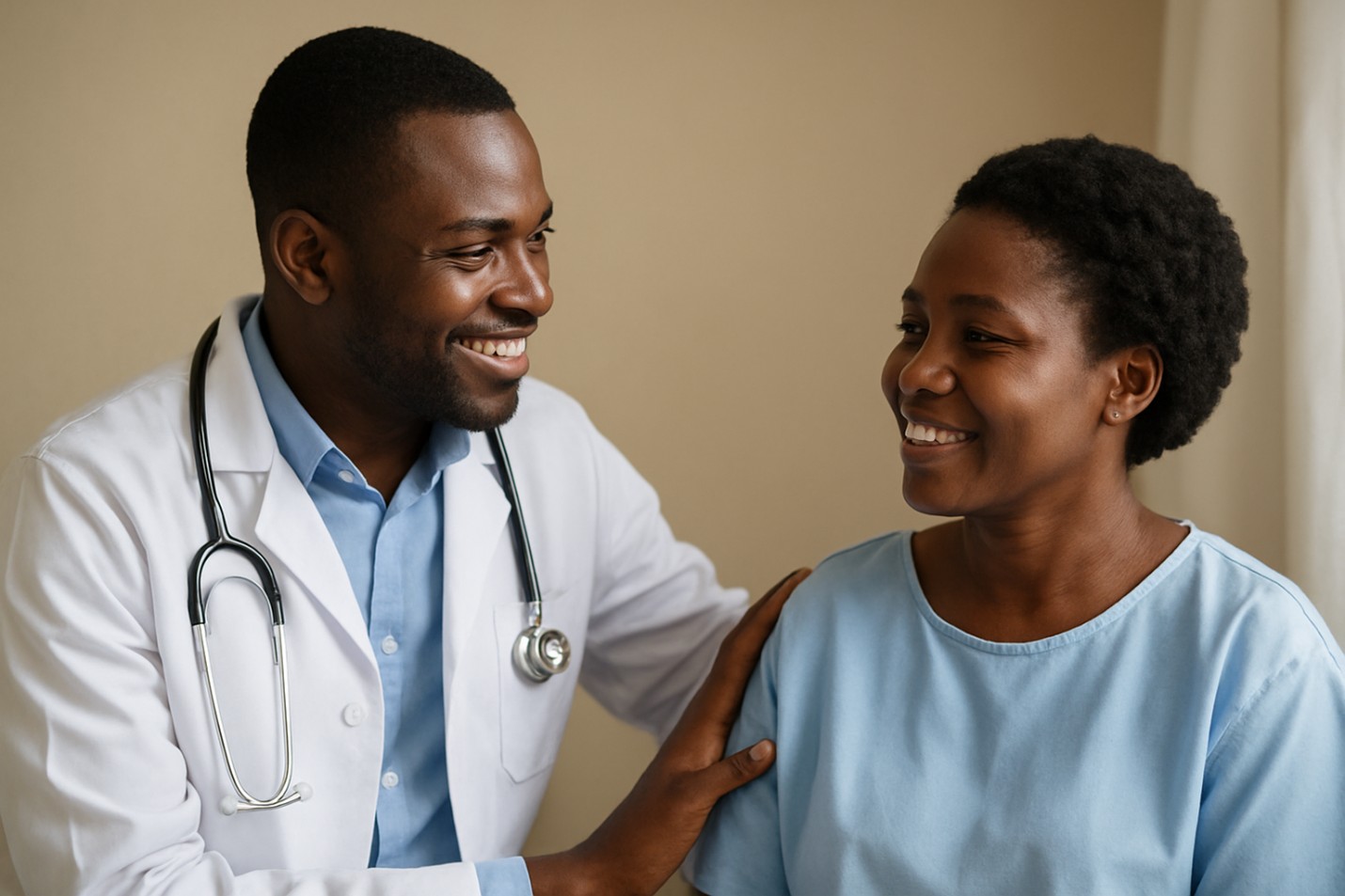 Photo of a smiling African doctor with a patient, symbolising professional support in aid of hope and recovery for the patient’s condition. AI image generated from ChatGPT. Click on iamge to enlarge.