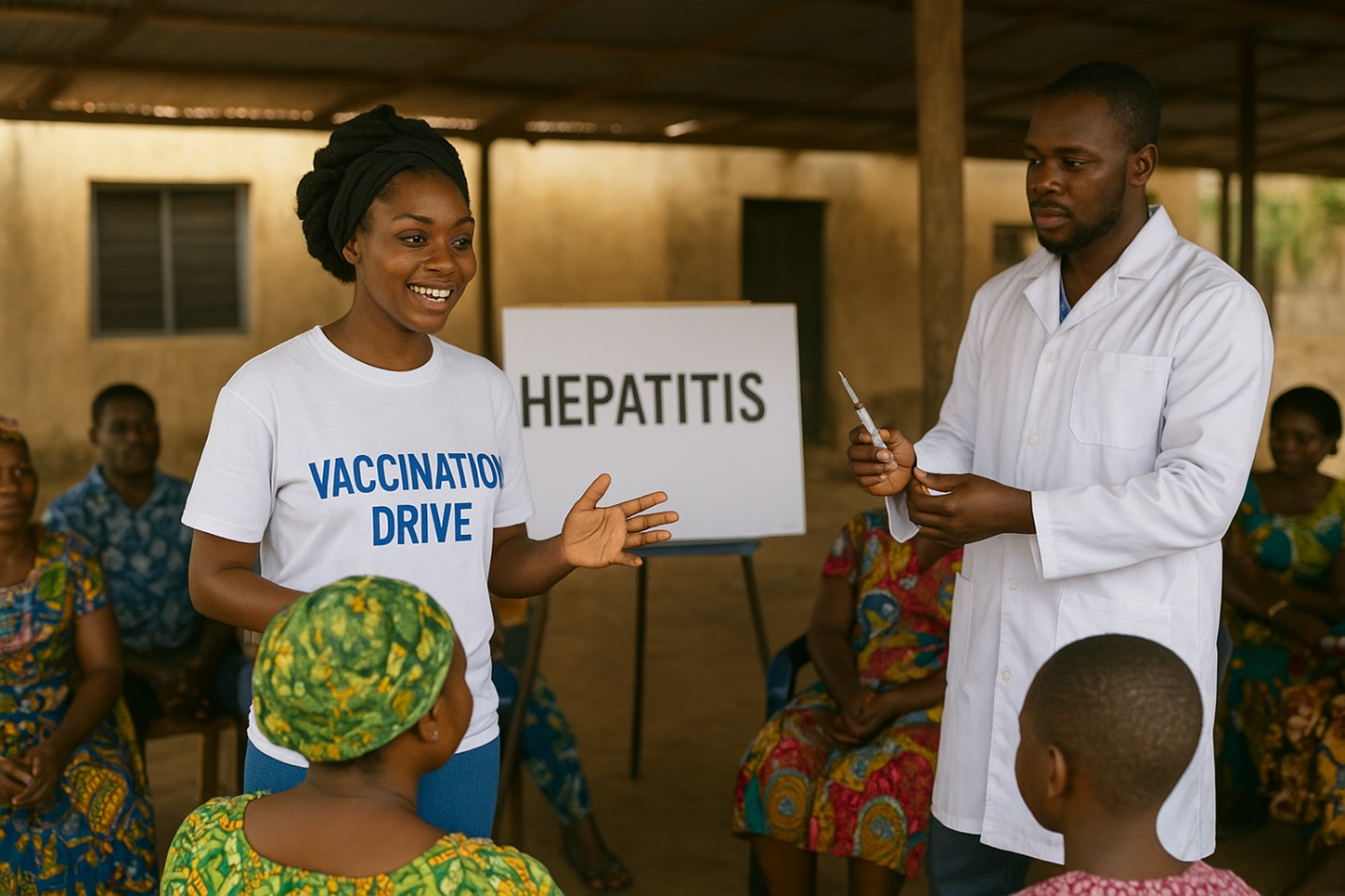 Photo of female and male community health workers educating a group of African women in an outdoor shed on hepatitis and how to prevent jaundice. AI image generated from ChatGPT. Click on image to enarge.