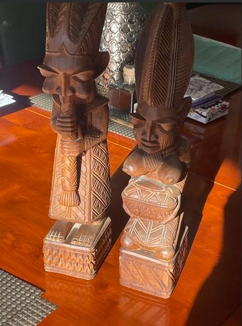My other significant purchases in Nigeria were wooden statues, made from Iroko wood. These were carved by a very skilled Yoruba craftsman, Gani Fakeye. Fakeye lived in Ibadan, and I was able to go to his workshop and make my selection. I chose two, a “flute player” and a woman holding a casket whose breasts were exposed and jutted out somewhat in front of her. This latter statue was bought as a gift for my maternal grandmother who definitely wasn’t at all impressed with the nudity of the statue and it was eventually returned to me after her death. I had never understood why the term “passed” is used when people die. I suppose it just means “passed on” but just used by itself makes me wonder “what did they pass” – maybe wind?