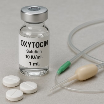 A vial of oxytocin solution, placed beside three white misoprostol tablets and a balloon catheter on a light gray surface. Image credit: ChatGpt