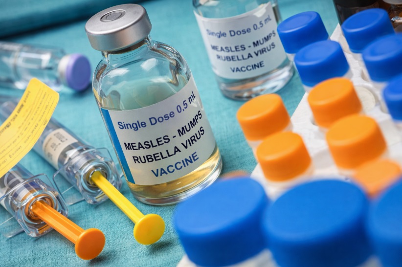 Image of syringes, measles-mumps-rubella (MMR) vaccine vials and other vaccination items arranged on a table. Image created from ChatGPT
