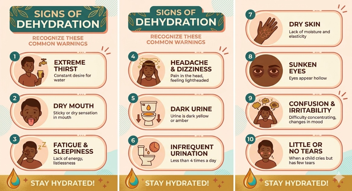 AI-generated Infographics on the signs of dehydration. Image Credit| Gemini AI. Click on image to enlarge.
