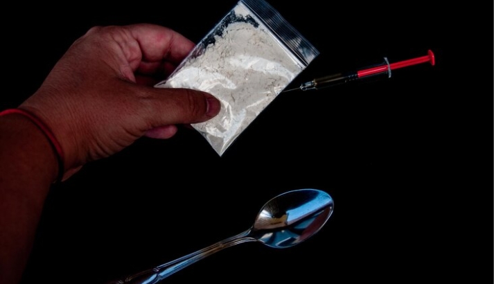 A small portion of heroin in a transparent bag with a teaspoon and syringe and needle in the background. Click on image to enlarge. Image credit: Freepik.