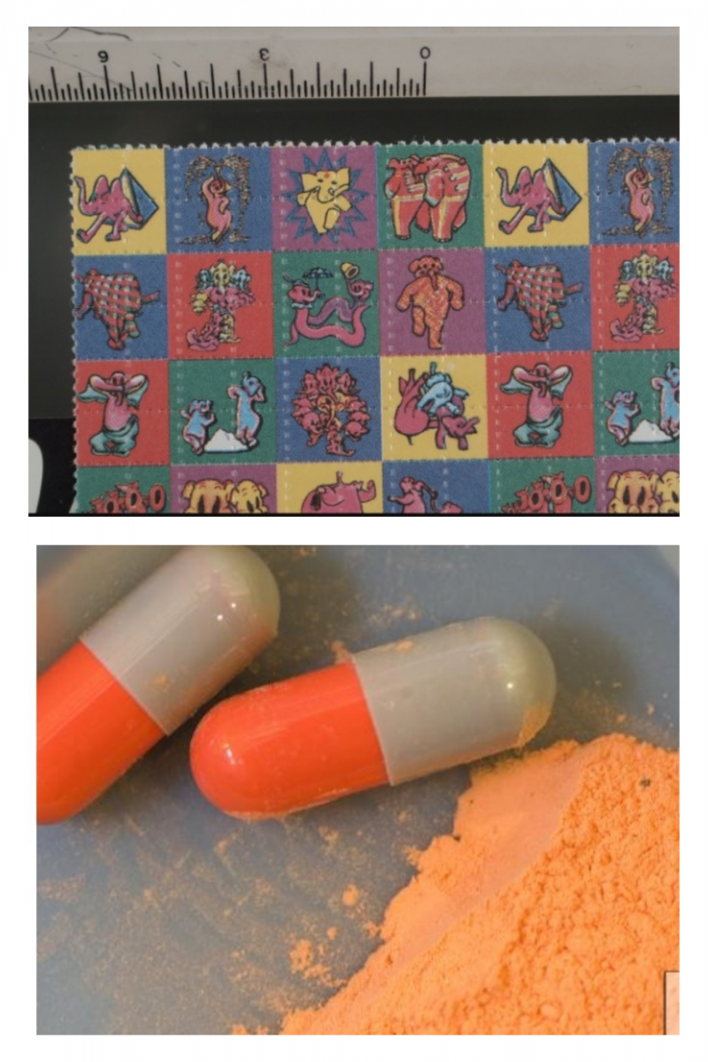 An LSD blotter sheet, capsule, and powder from the U.S. DEA article. Click on image to enlarge.