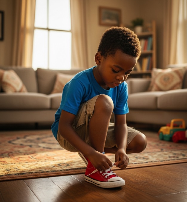 An African child tying his shoe lace at home. Click on image to enlarge. Image credit Google Gemini
