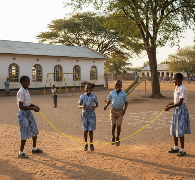 African children enjoying a game of skipping rope during recess in school. Click on image to enlarge. Image credit: Google Gemini