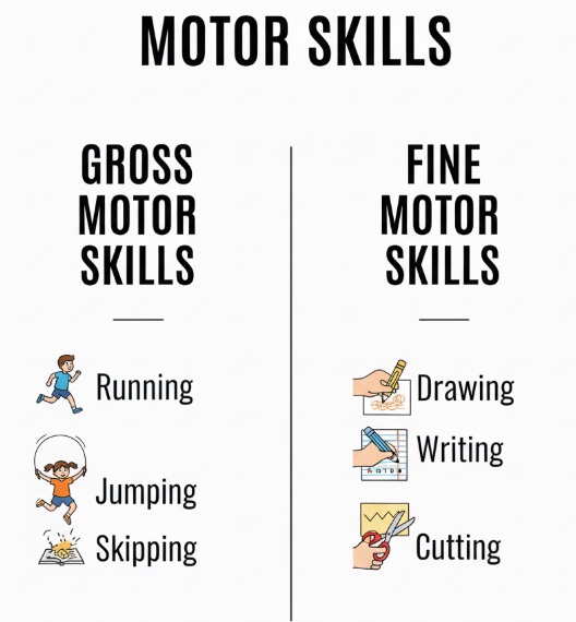 Motor skills are abilities that involve the use of muscles to move the parts of the body and perform actions. Motor skills can be further divided into gross motor skills and fine motor skills.