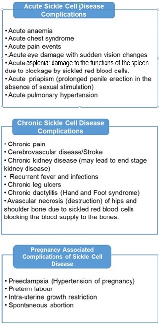 Sickle cell disease can cause a host of complications due to organ damage, infections and blood clots. The complications can be grouped into acute or sudden, chronic or late and those associated with pregnancy as detailed in Table 1.