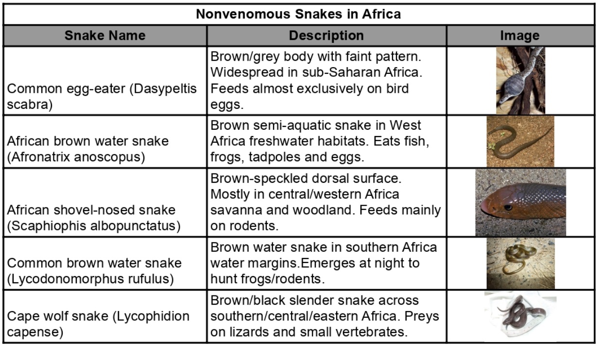 Table 1: Listing of common non-venomous snakes in Africa, with brief descriptions (colours, region & diet), and their images.