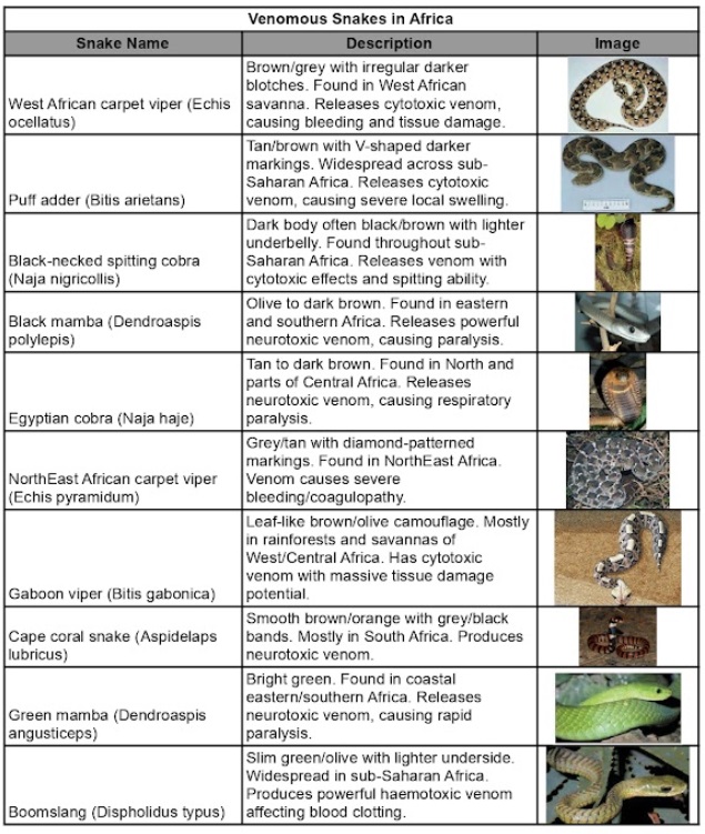 Table 2: Listing common venomous snakes in Africa, brief descriptions (colours, region, & venom or diet), and their images. Click on image to enlarge.