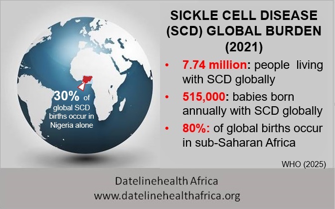 An infographic summarising the burden of Sickle Cell Disease in Africa and globally. Data from WHO (2025)