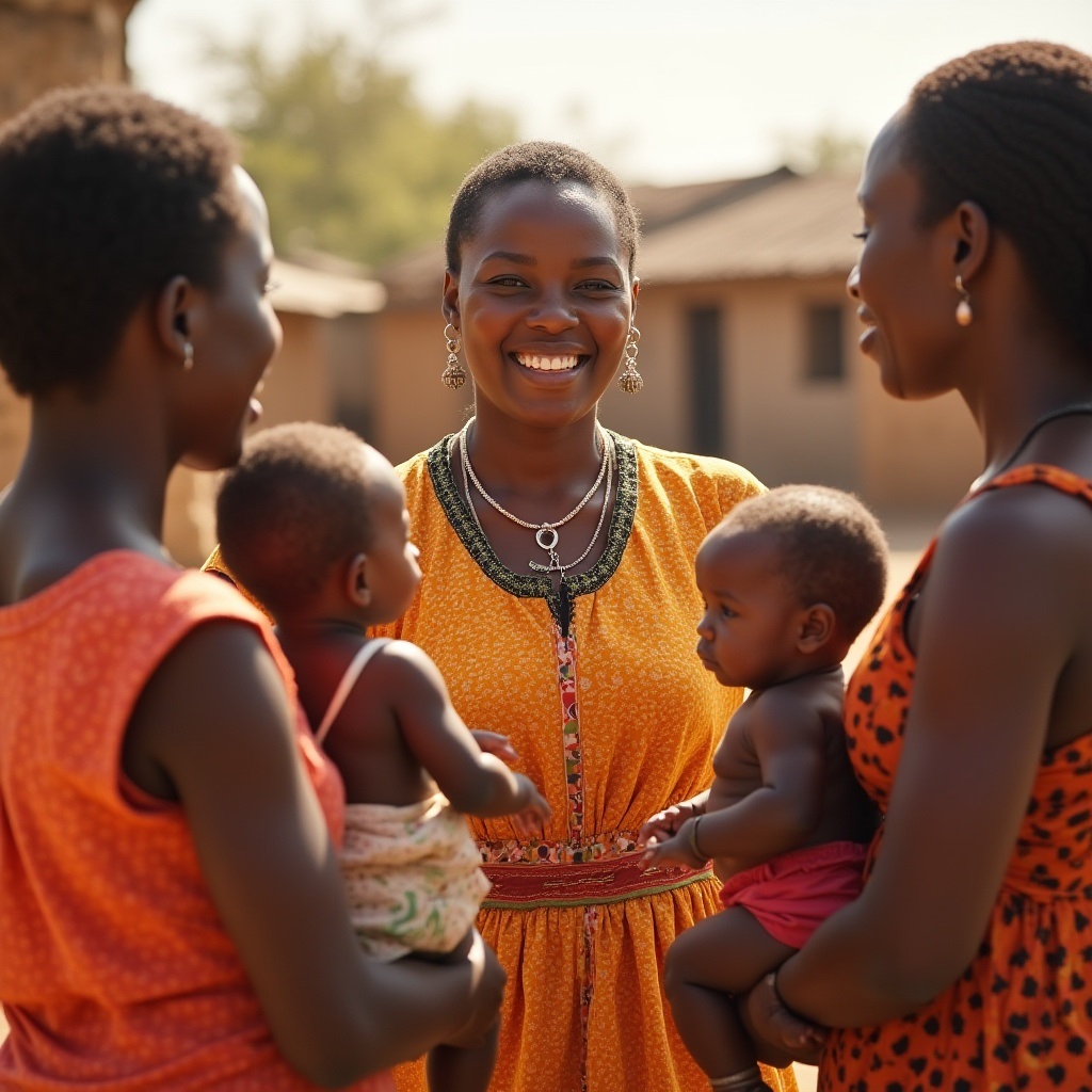 Photo of a young African female health worker in brightly coloured dress with a big smile, speaking with two mothers carrying their babies about infant care in an outdoor clinic. AI generated image credit from Freepik