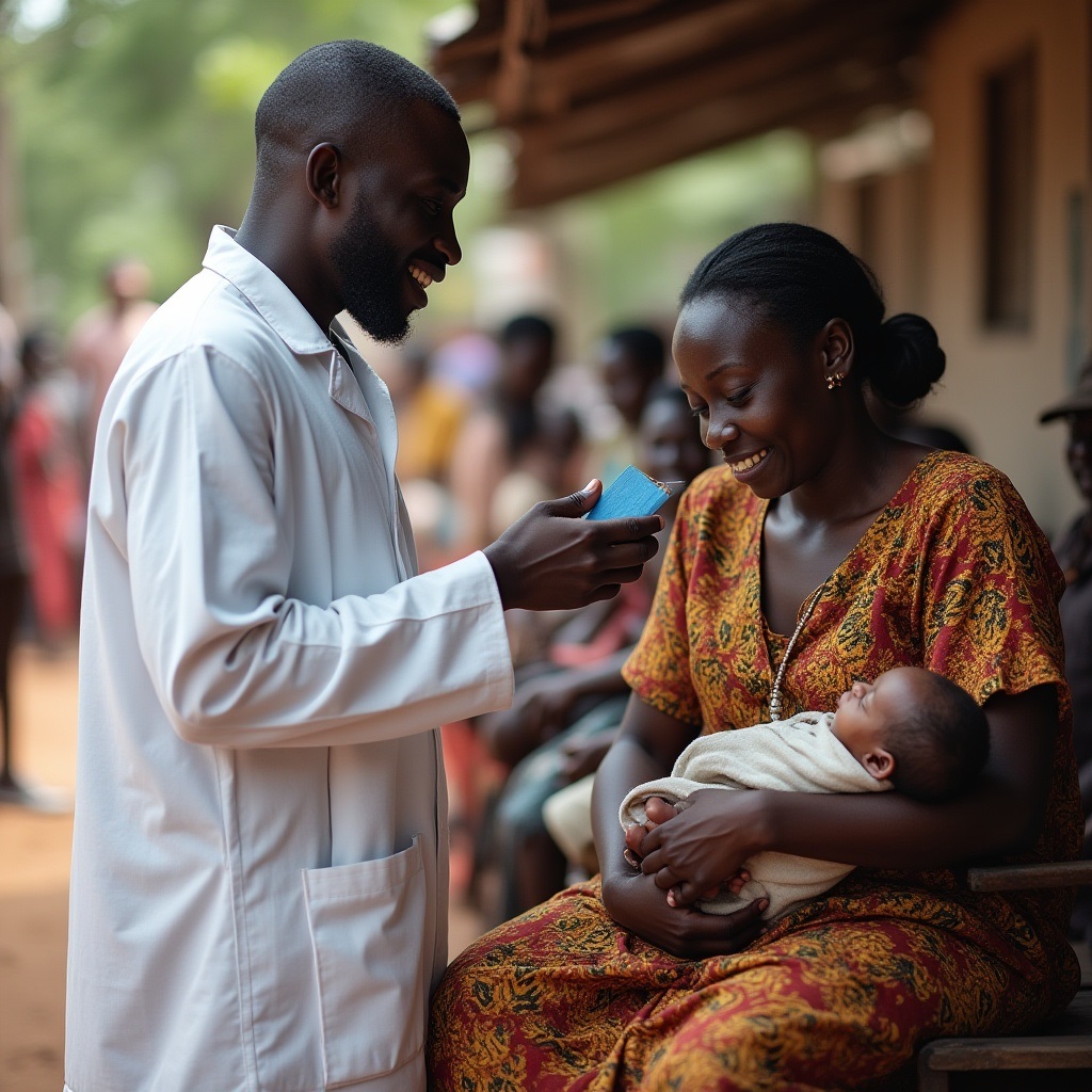 A male African health worker with a friendly smile wearing a lab coat, speaking casually with a mother sitting in a community outdoor clinic and carrying her baby on her lap. This type of encounter is a good point for health workers to convey information to parents of newborn babies in African communities about early genetic screening for sickle cell disease. AI generated image from: Freepik