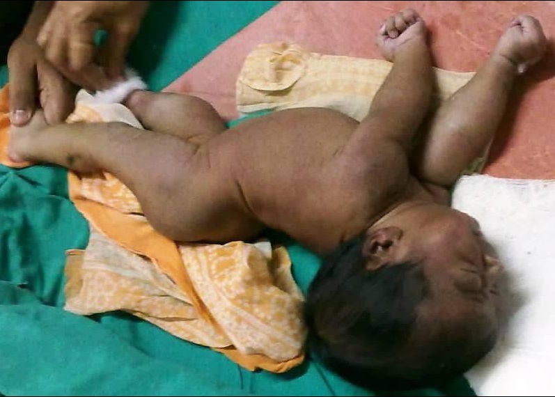 Image of an African baby with tetanus. Note that due to muscle spasm, the baby’s head is thrown back on the neck, the back is arched inwards and the limbs are held straight and in stiff posture. Image credit: Chipo James Mainda. Click on image to enlarge.