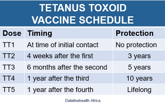 6. Rabadi T, Brady MF. Tetanus Toxoid. [Updated 2023 May 1]. In: StatPearls [Internet]. Treasure Island (FL): StatPearls Publishing; 2025 Jan- Available from here.